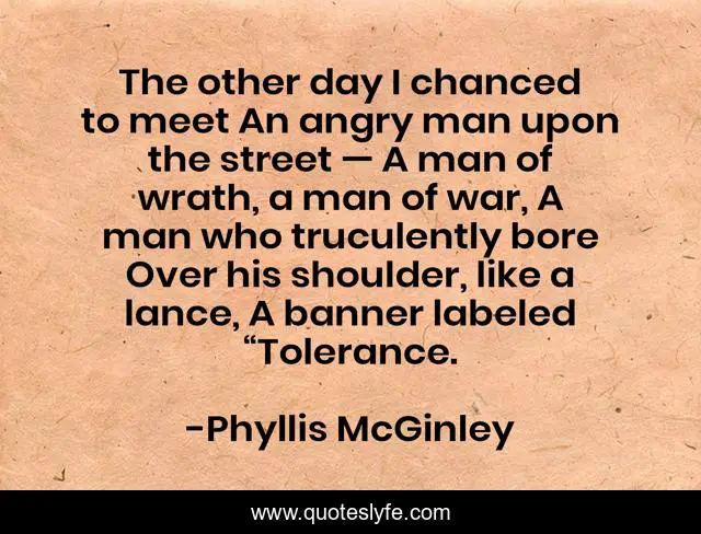 This page presents the quote "The other day I chanced to meet An angry man upon the street — A man of wrath, a man of war, A man who truculently bore Over his shoulder, like a lance, A banner labeled “Tolerance.". Author of this quote is Phyllis McGinley. This quote is about poem, angry, angryman, man,.