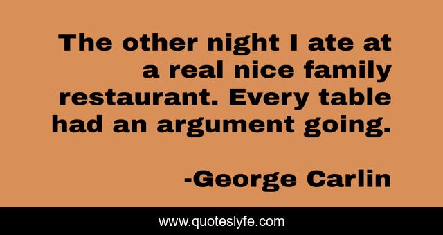 This page presents the quote "The other night I ate at a real nice family restaurant. Every table had an argument going.". Author of this quote is George Carlin. This quote is about night, nice, restaurant,.