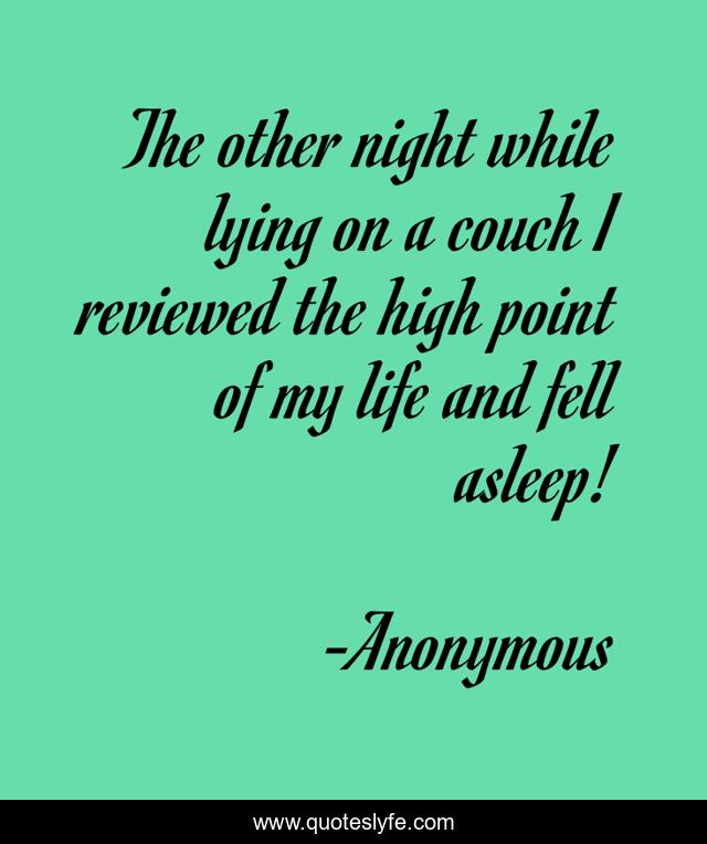 This page presents the quote "The other night while lying on a couch I reviewed the high point of my life and fell asleep!". Author of this quote is Anonymous. This quote is about life, death,.