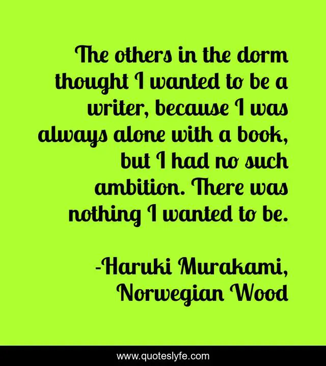 This page presents the quote "The others in the dorm thought I wanted to be a writer, because I was always alone with a book, but I had no such ambition. There was nothing I wanted to be.". Author of this quote is Haruki Murakami, Norwegian Wood. This quote is about ennui, life, ambition,.