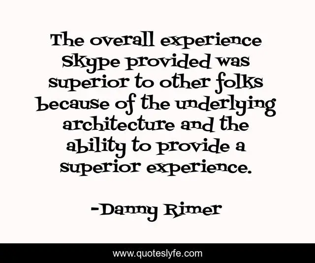 "Danny Rimer Quotes." Quoteslyfe.com, 2025. Fri. 05 Dec. 2025. <https://www.quoteslyfe.com/quote/The-overall-experience-Skype-provided-was-superior-299688>.