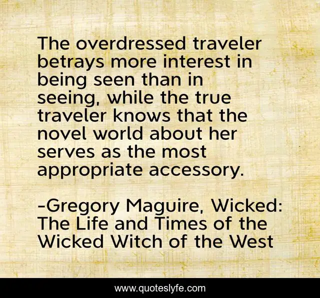 This page presents the quote "The overdressed traveler betrays more interest in being seen than in seeing, while the true traveler knows that the novel world about her serves as the most appropriate accessory.". Author of this quote is Gregory Maguire, Wicked: The Life and Times of the Wicked Witch of the West. This quote is about gregory-maguire, travel, wicked, inspirational, enthusiasm,.