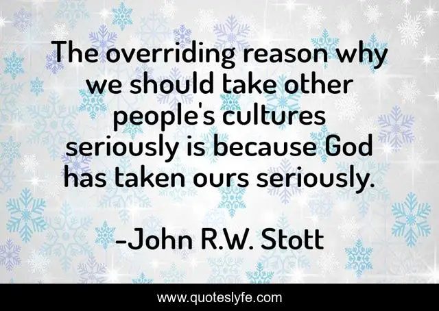 This page presents the quote "The overriding reason why we should take other people's cultures seriously is because God has taken ours seriously.". Author of this quote is John R.W. Stott. This quote is about culture, christianity, missions, god, culture-identity,.