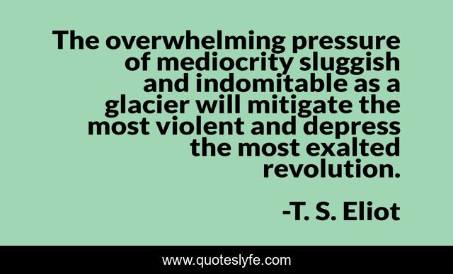 This page presents the quote "The overwhelming pressure of mediocrity sluggish and indomitable as a glacier will mitigate the most violent and depress the most exalted revolution.". Author of this quote is T. S. Eliot. This quote is about revolution, reform,.