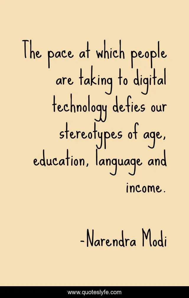 This page presents the quote "The pace at which people are taking to digital technology defies our stereotypes of age, education, language and income.". Author of this quote is Narendra Modi. This quote is about age, education, language,.