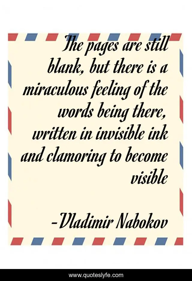 This page presents the quote "The pages are still blank, but there is a miraculous feeling of the words being there, written in invisible ink and clamoring to become visible". Author of this quote is Vladimir Nabokov. This quote is about invisible, ink, pages, writing,.
