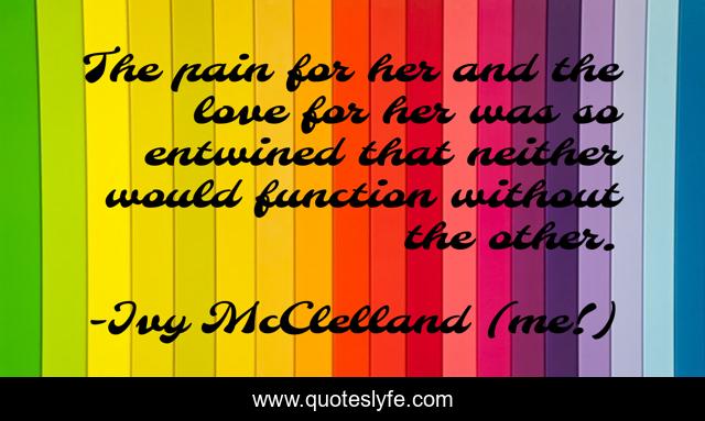 This page presents the quote "The pain for her and the love for her was so entwined that neither would function without the other.". Author of this quote is Ivy McClelland (me!). This quote is about love, heartbreak, pain, affection,.