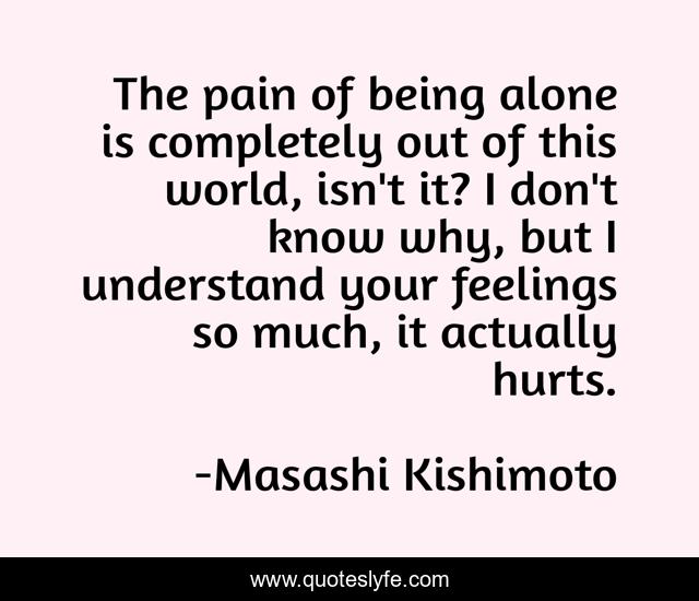 This page presents the quote "The pain of being alone is completely out of this world, isn't it? I don't know why, but I understand your feelings so much, it actually hurts.". Author of this quote is Masashi Kishimoto. This quote is about naruto, loneliness, understanding,.