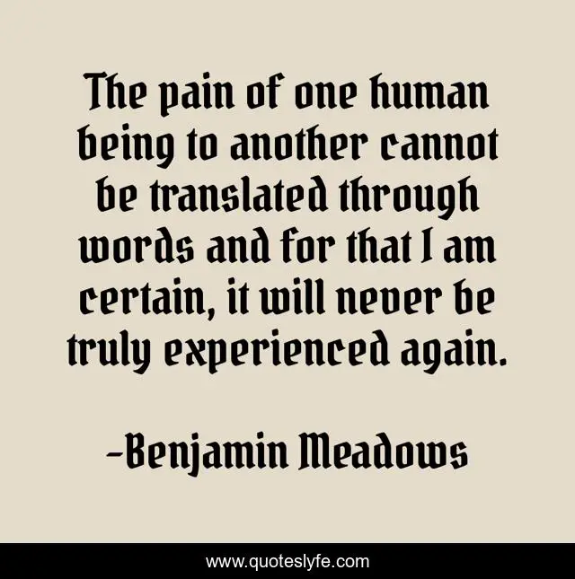This page presents the quote "The pain of one human being to another cannot be translated through words and for that I am certain, it will never be truly experienced again.". Author of this quote is Benjamin Meadows. This quote is about emotion, communication, experiences, human, pain,.