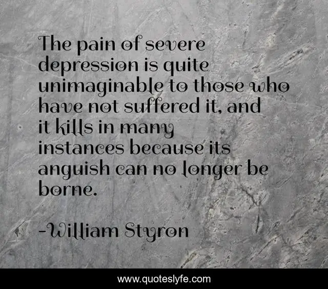 This page presents the quote "The pain of severe depression is quite unimaginable to those who have not suffered it, and it kills in many instances because its anguish can no longer be borne.". Author of this quote is William Styron. This quote is about severe-depression, darkness, memoir-of-madness, styron, william, visible, depression,.