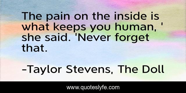 This page presents the quote "The pain on the inside is what keeps you human, ' she said. 'Never forget that.". Author of this quote is Taylor Stevens, The Doll. This quote is about emotion, empathy, pain, monster, compassion, suffering, human,.