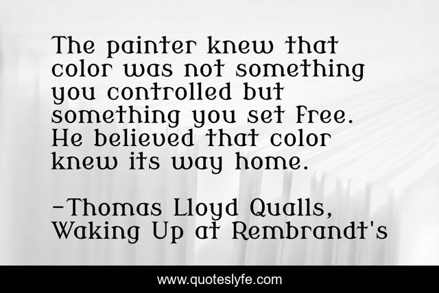 This page presents the quote "The painter knew that color was not something you controlled but something you set free. He believed that color knew its way home.". Author of this quote is Thomas Lloyd Qualls, Waking Up at Rembrandt's. This quote is about artists-life, art, beauty, creativity, painters, artists, painting,.