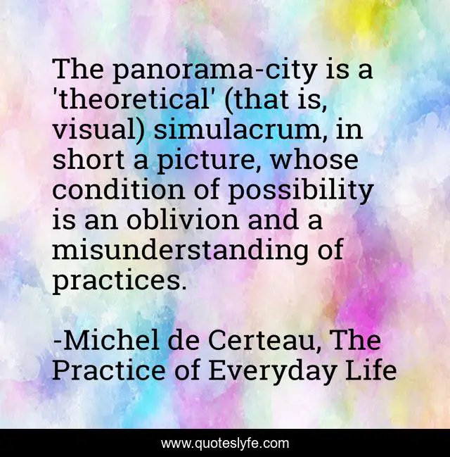 This page presents the quote "The panorama-city is a 'theoretical' (that is, visual) simulacrum, in short a picture, whose condition of possibility is an oblivion and a misunderstanding of practices.". Author of this quote is Michel de Certeau, The Practice of Everyday Life. This quote is about city, 93, panorama, skyline, view,.