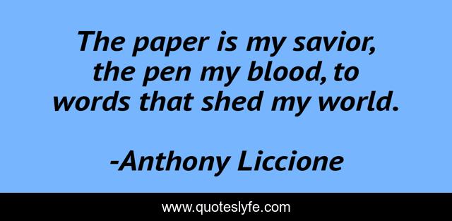 This page presents the quote "The paper is my savior, the pen my blood, to words that shed my world.". Author of this quote is Anthony Liccione. This quote is about love, words, craft, paper, ink, need, goal, writer, writing,.