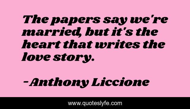 This page presents the quote "The papers say we're married, but it's the heart that writes the love story.". Author of this quote is Anthony Liccione. This quote is about true-love, heart, words-written, vows, compassion, couple, commitment, loyalty, marriage,.