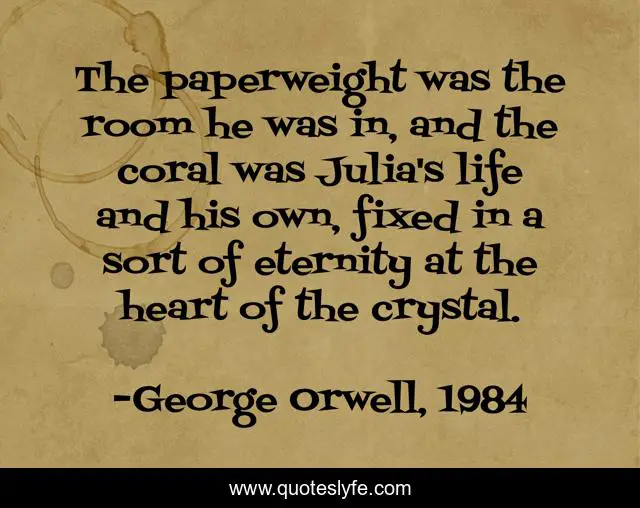 This page presents the quote "The paperweight was the room he was in, and the coral was Julia's life and his own, fixed in a sort of eternity at the heart of the crystal.". Author of this quote is George Orwell, 1984. This quote is about beautiful, 1984, beautiful-imagery, deep, george-orwell, different-worlds, dystopian-fiction,.