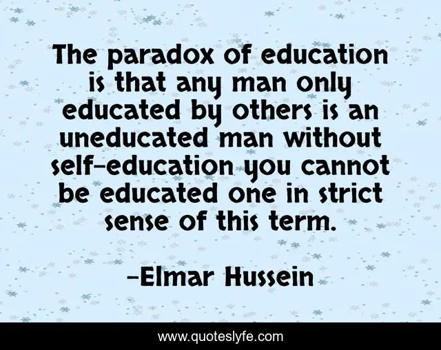 This page presents the quote "The paradox of education is that any man only educated by others is an uneducated man without self-education you cannot be educated one in strict sense of this term.". Author of this quote is Elmar Hussein. This quote is about education, paradox,.