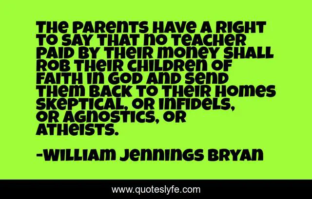 This page presents the quote "The parents have a right to say that no teacher paid by their money shall rob their children of faith in God and send them back to their homes skeptical, or infidels, or agnostics, or atheists.". Author of this quote is William Jennings Bryan. This quote is about have-a-right, atheists, infidels, agnostics, parents, teacher,.