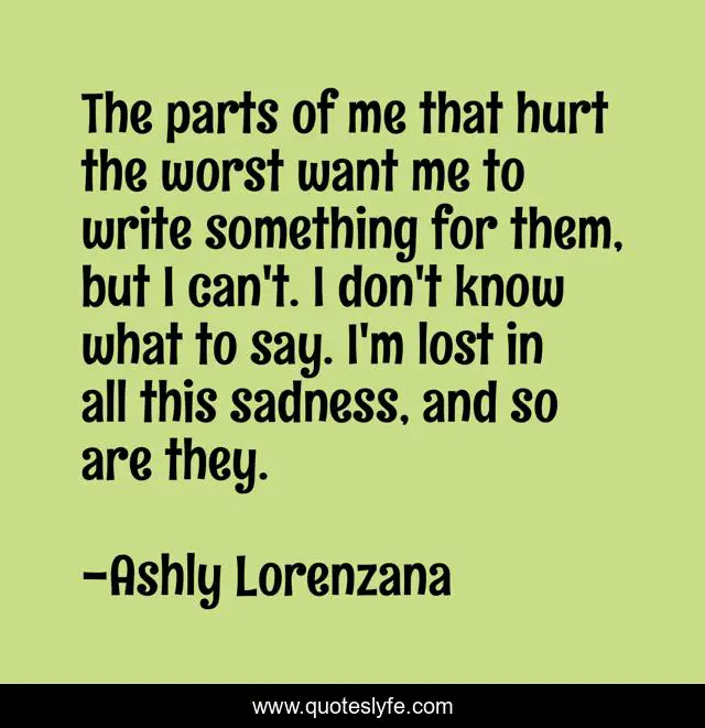 This page presents the quote "The parts of me that hurt the worst want me to write something for them, but I can't. I don't know what to say. I'm lost in all this sadness, and so are they.". Author of this quote is Ashly Lorenzana. This quote is about pain, suffering, emotions, poetry, sadness, writing,.