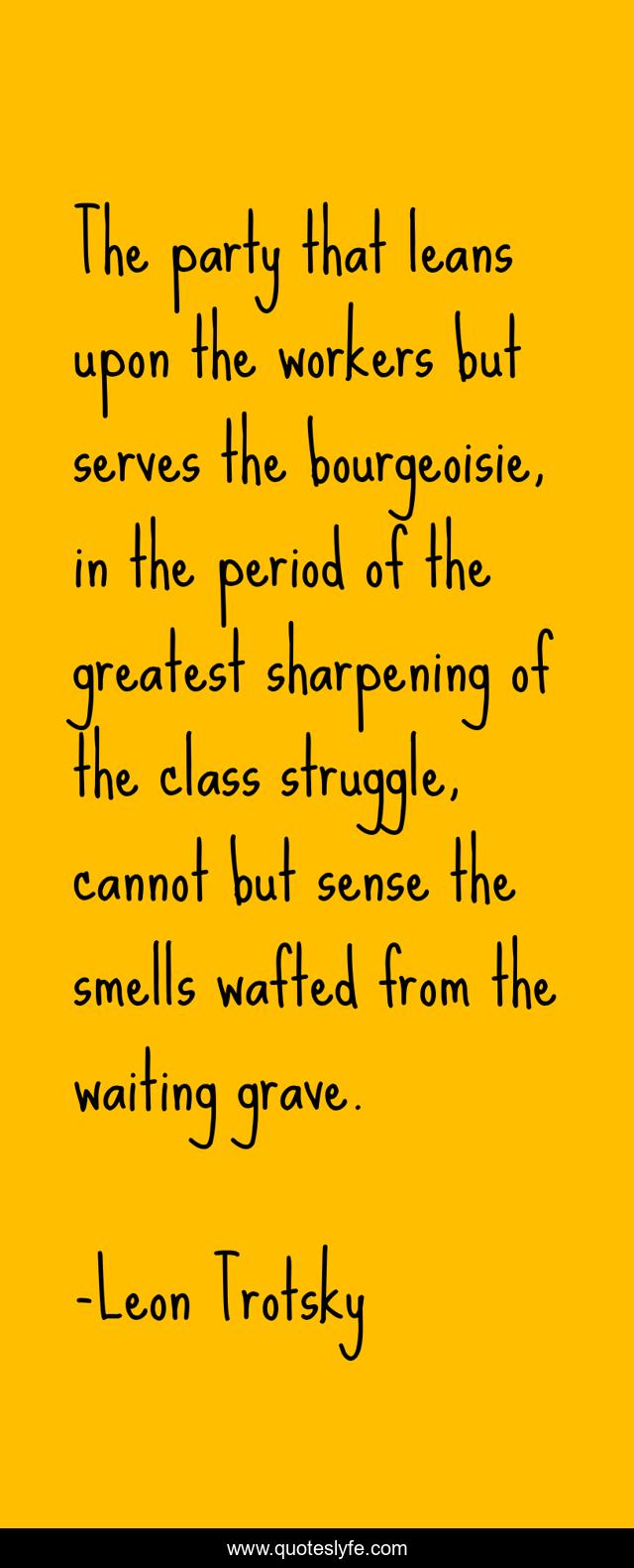 This page presents the quote "The party that leans upon the workers but serves the bourgeoisie, in the period of the greatest sharpening of the class struggle, cannot but sense the smells wafted from the waiting grave.". Author of this quote is Leon Trotsky. This quote is about trotskyism, bourgeoisie, socialism, class-struggle, marxism,.