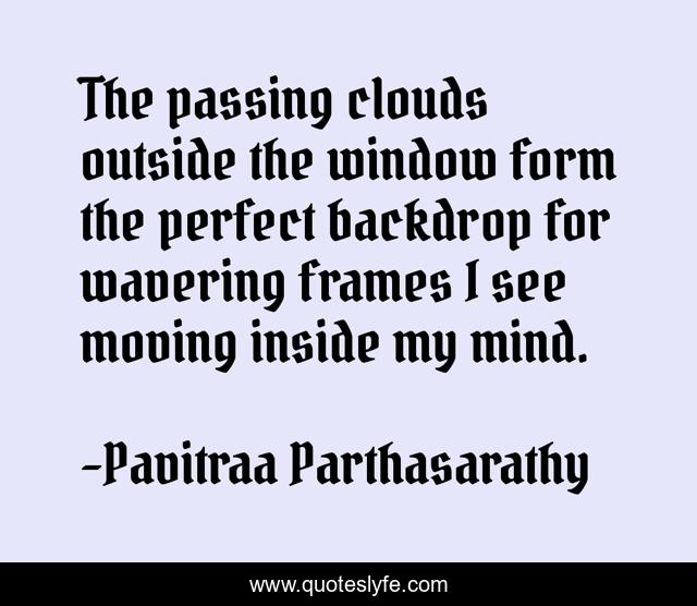 This page presents the quote "The passing clouds outside the window form the perfect backdrop for wavering frames I see moving inside my mind.". Author of this quote is Pavitraa Parthasarathy. This quote is about clouds, mind, window, wavering, frames, passing,.