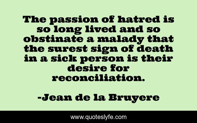 This page presents the quote "The passion of hatred is so long lived and so obstinate a malady that the surest sign of death in a sick person is their desire for reconciliation.". Author of this quote is Jean de la Bruyere. This quote is about hatred, passion, long,.