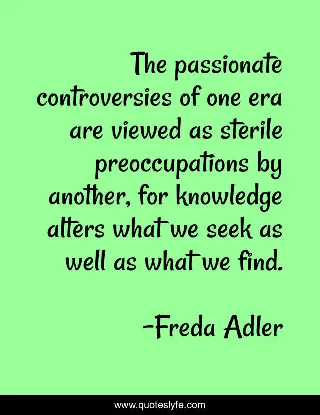 This page presents the quote "The passionate controversies of one era are viewed as sterile preoccupations by another, for knowledge alters what we seek as well as what we find.". Author of this quote is Freda Adler. This quote is about passionate, well, find,.