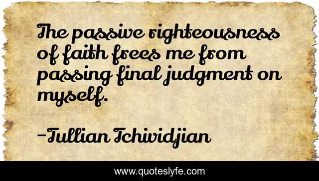 This page presents the quote "The passive righteousness of faith frees me from passing final judgment on myself.". Author of this quote is Tullian Tchividjian. This quote is about condemnation, guilt, self-centeredness,.