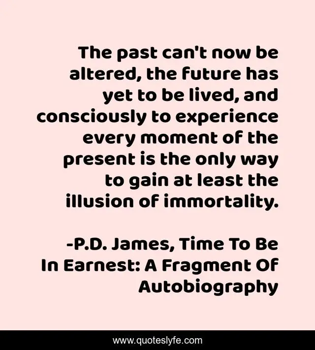This page presents the quote "The past can't now be altered, the future has yet to be lived, and consciously to experience every moment of the present is the only way to gain at least the illusion of immortality.". Author of this quote is P.D. James, Time To Be In Earnest: A Fragment Of Autobiography. This quote is about immortality, past-and-present,.