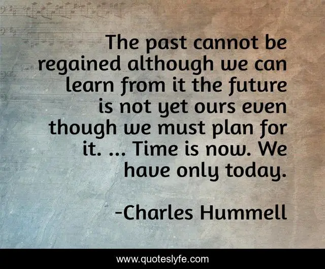 This page presents the quote "The past cannot be regained although we can learn from it the future is not yet ours even though we must plan for it. ... Time is now. We have only today.". Author of this quote is Charles Hummell. .