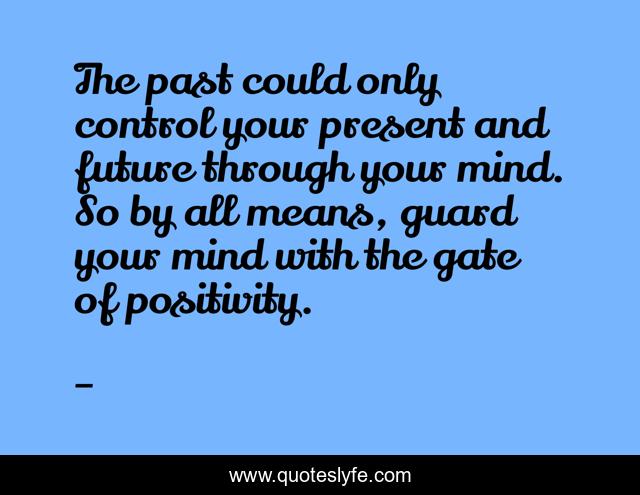 This page presents the quote "The past could only control your present and future through your mind. So by all means, guard your mind with the gate of positivity.". Author of this quote is . This quote is about your-future, your-present, guard-your-mind, edmond-mbiaka, positivity, your-past-negative-experiences, your-present-and-future, controlling-your-life,.