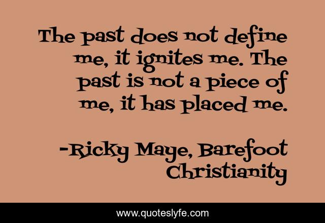 This page presents the quote "The past does not define me, it ignites me. The past is not a piece of me, it has placed me.". Author of this quote is Ricky Maye, Barefoot Christianity. This quote is about faith, life, christian, behaviour, quote, progressing, spiritual, wisdom, past,.