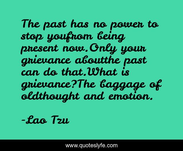 This page presents the quote "The past has no power to stop youfrom being present now.Only your grievance aboutthe past can do that.What is grievance?The baggage of oldthought and emotion.". Author of this quote is Lao Tzu. This quote is about enthusiasm, inspirational,.