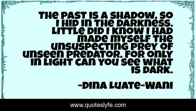 This page presents the quote "The past is a shadow, so I hid in the darkness. Little did I know I had made myself the unsuspecting prey of unseen predator. For only in light can you see what is dark.". Author of this quote is Dina Luate-Wani. .