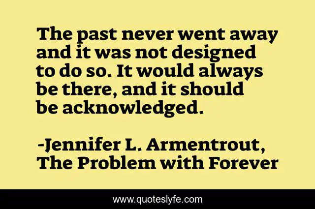 This page presents the quote "The past never went away and it was not designed to do so. It would always be there, and it should be acknowledged.". Author of this quote is Jennifer L. Armentrout, The Problem with Forever. This quote is about past, hurt, future, remember, moving-on,.