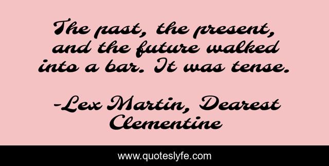 This page presents the quote "The past, the present, and the future walked into a bar. It was tense.". Author of this quote is Lex Martin, Dearest Clementine. This quote is about funny, humor, words, grammar-humor, joke, laugh, hilarious, grammar, comedy,.