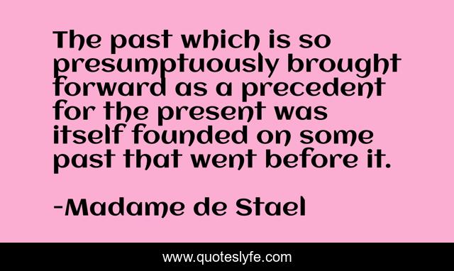 This page presents the quote "The past which is so presumptuously brought forward as a precedent for the present was itself founded on some past that went before it.". Author of this quote is Madame de Stael. .