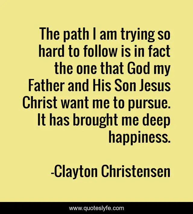 This page presents the quote "The path I am trying so hard to follow is in fact the one that God my Father and His Son Jesus Christ want me to pursue. It has brought me deep happiness.". Author of this quote is Clayton Christensen. This quote is about god, father, deep,.