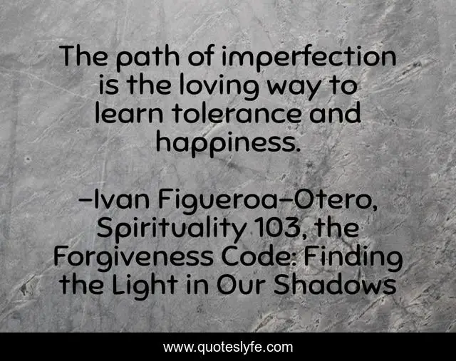 This page presents the quote "The path of imperfection is the loving way to learn tolerance and happiness.". Author of this quote is Ivan Figueroa-Otero, Spirituality 103, the Forgiveness Code: Finding the Light in Our Shadows. This quote is about forgiveness, happiness,.