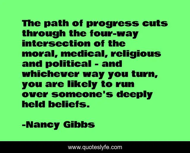 This page presents the quote "The path of progress cuts through the four-way intersection of the moral, medical, religious and political - and whichever way you turn, you are likely to run over someone's deeply held beliefs.". Author of this quote is Nancy Gibbs. This quote is about progress, political, path,.