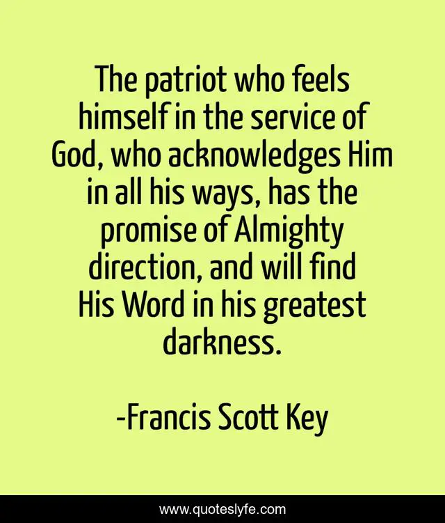 This page presents the quote "The patriot who feels himself in the service of God, who acknowledges Him in all his ways, has the promise of Almighty direction, and will find His Word in his greatest darkness.". Author of this quote is Francis Scott Key. This quote is about darkness, service, greatest,.