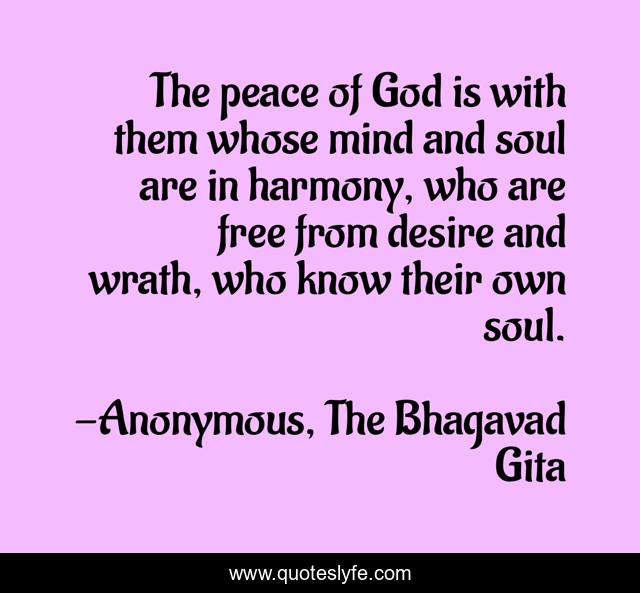This page presents the quote "The peace of God is with them whose mind and soul are in harmony, who are free from desire and wrath, who know their own soul.". Author of this quote is Anonymous, The Bhagavad Gita. .