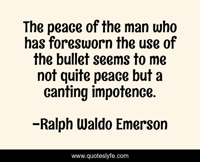 This page presents the quote "The peace of the man who has foresworn the use of the bullet seems to me not quite peace but a canting impotence.". Author of this quote is Ralph Waldo Emerson. .