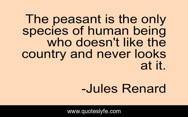 This page presents the quote "The peasant is the only species of human being who doesn't like the country and never looks at it.". Author of this quote is Jules Renard. This quote is about nature, peasants,.
