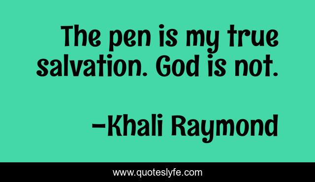 This page presents the quote "The pen is my true salvation. God is not.". Author of this quote is Khali Raymond. This quote is about god, pen, love, salvation, affection,.