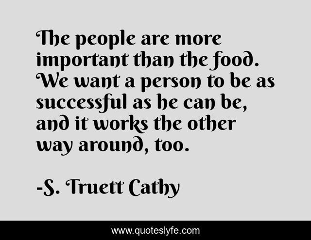 This page presents the quote "The people are more important than the food. We want a person to be as successful as he can be, and it works the other way around, too.". Author of this quote is S. Truett Cathy. This quote is about successful, people,.