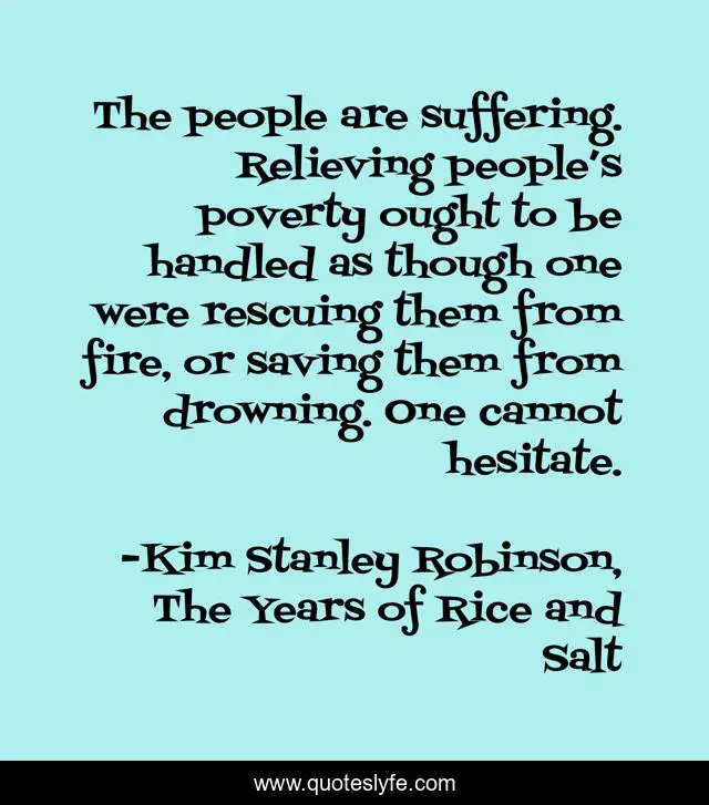 This page presents the quote "The people are suffering. Relieving people’s poverty ought to be handled as though one were rescuing them from fire, or saving them from drowning. One cannot hesitate.". Author of this quote is Kim Stanley Robinson, The Years of Rice and Salt. This quote is about compassion, suffering, poverty,.