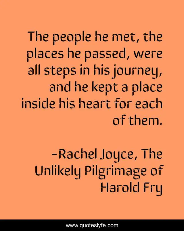 This page presents the quote "The people he met, the places he passed, were all steps in his journey, and he kept a place inside his heart for each of them.". Author of this quote is Rachel Joyce, The Unlikely Pilgrimage of Harold Fry. This quote is about place-in-heart, journey, steps,.