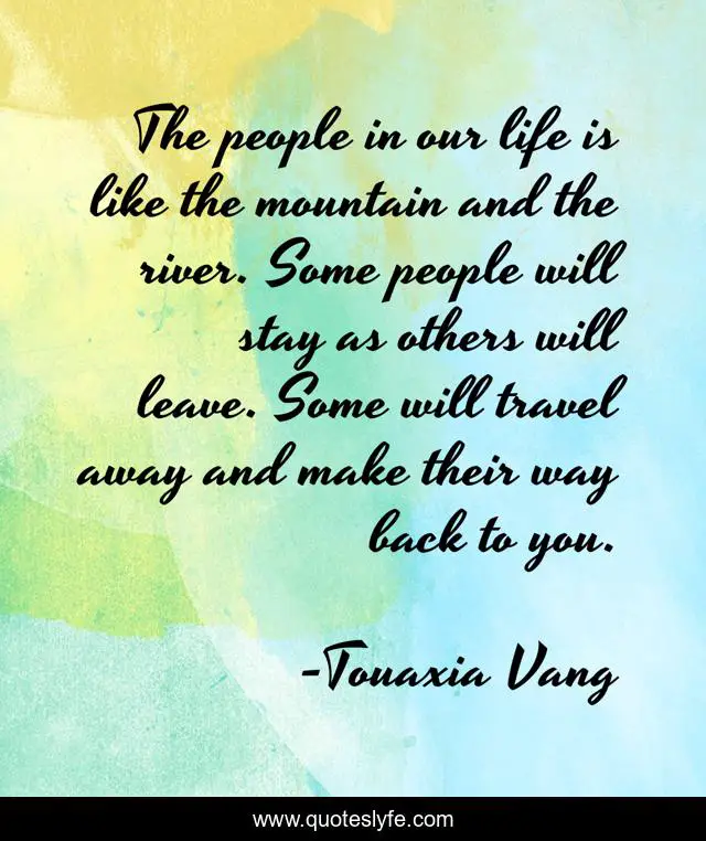 This page presents the quote "The people in our life is like the mountain and the river. Some people will stay as others will leave. Some will travel away and make their way back to you.". Author of this quote is Touaxia Vang. This quote is about relationships, human-nature, people-relations, friendships, life-and-living, hope,.