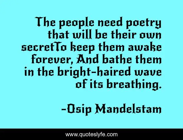 This page presents the quote "The people need poetry that will be their own secretTo keep them awake forever, And bathe them in the bright-haired wave of its breathing.". Author of this quote is Osip Mandelstam. This quote is about existence, poetry,.